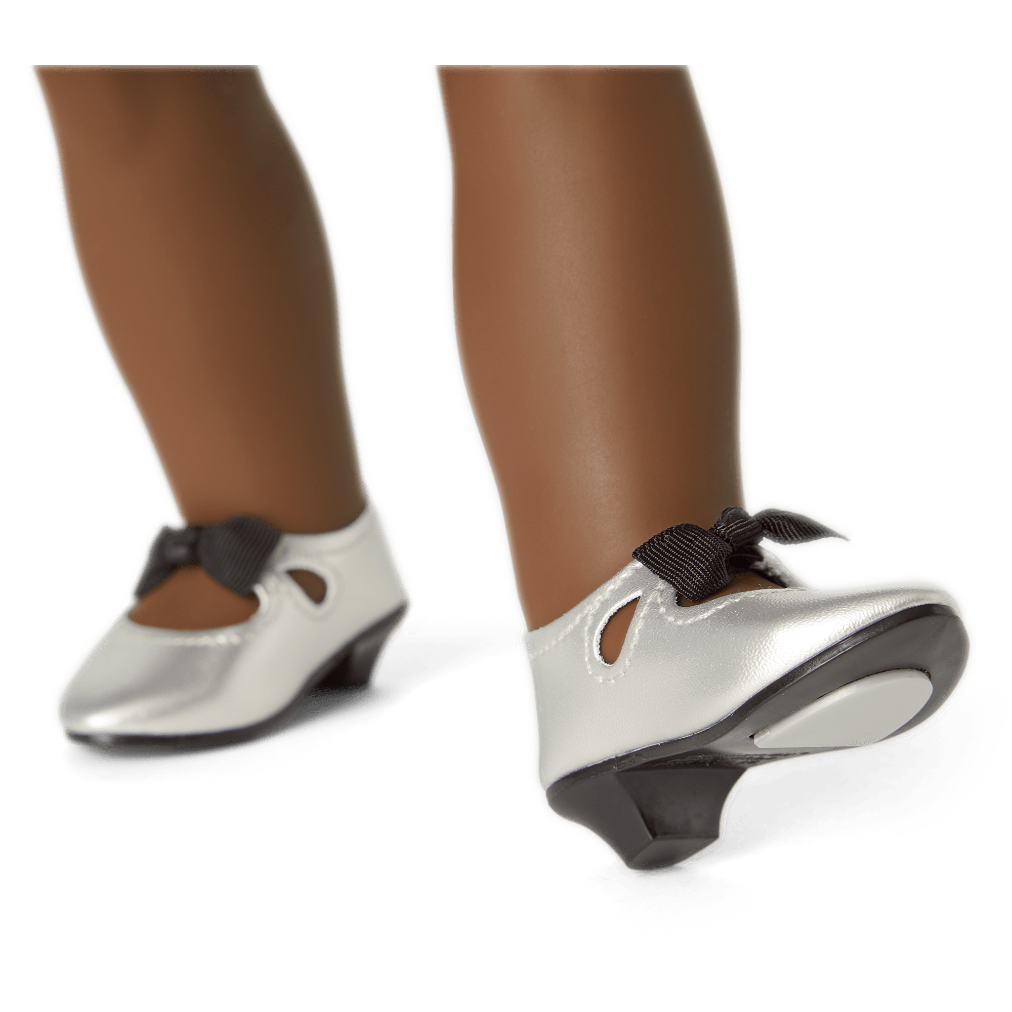 Claudie’s Jazz Performance Outfit for 18-inch Dolls: A purple satin dress with black ruffles, a matching satin headband with a large bow on the side, and a pair of silver sparkle tap shoes