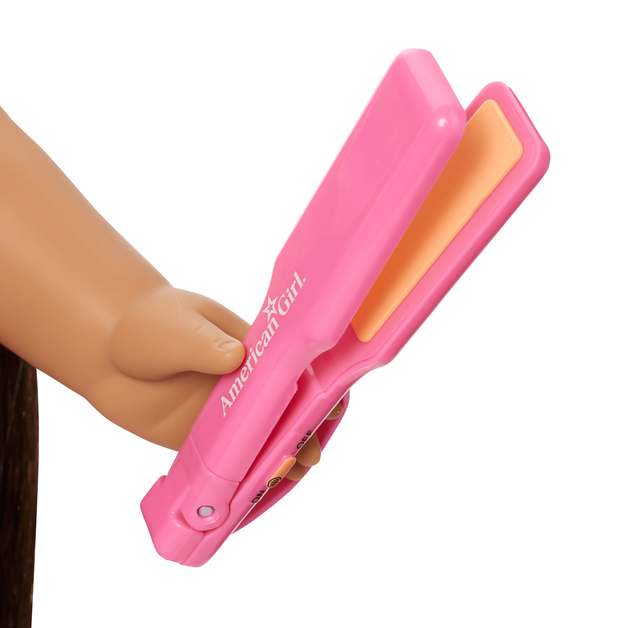 A pretend pink-and-orange flat iron that opens and closes and includes a strap for dolls to hold