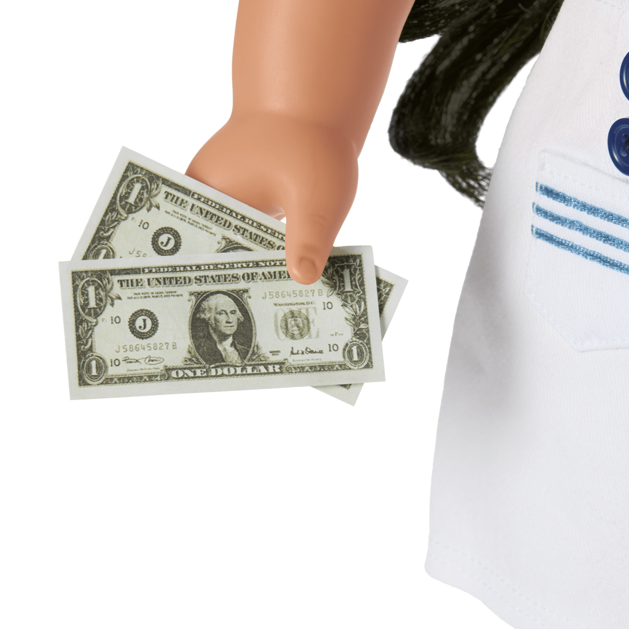Kindhearted Nanea Mitchell has big, lifelike hazel eyes that open and close smoothly, and realistic wavy dark-brown hair styled with a red faux-hibiscus hair clip. She comes in an authentic 1940s-style outfit: